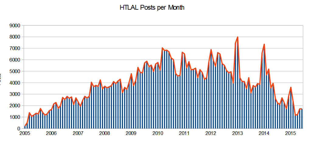 Since the need for off-HTLAL communication became evident, Twitter and Facebook pages were started. This wikia's front page has also been used for announcements ever since. A placeholder forum was started by rdearman. Members showed increasing frustration and/or anxiety about the forum future.